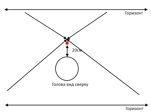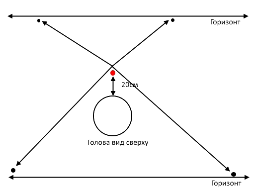 1. Сосредотачиваем внимание на точке примерно в 20 см перед центром лба (красная точка).2. Формируем четыре точки: две точки разводим по углам вперёд в горизонт, две точки разводим по углам назад в горизонт, как показано на картинке. Удерживаем внимание в точках.