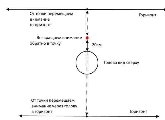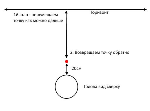 - Потом перемещаем точку по этой же прямой назад в горизонт, проводя через голову как можно дальше от красной точки. При достижении горизонта - удерживаем внимание в точке на горизонте какое-то время. Затем возвращаем точку из горизонта в красную точку.